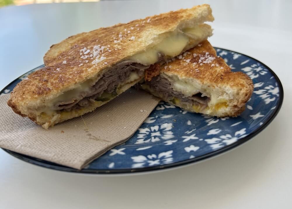 roast beef, cheese, pickles, onions, mustard and tomato sauce